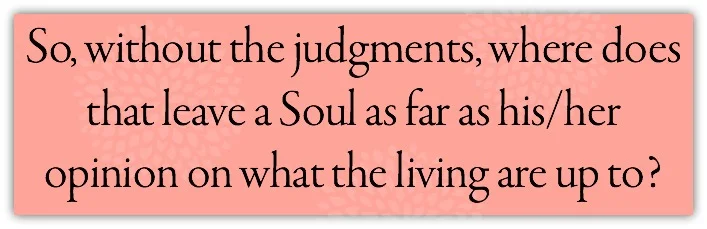 /In the last six weeks I have been inundated with questions from people who are driving themselves crazy, thinking their beloved Souls in Spirit must still be reacting to the bumps and jolts of life like humans do.
